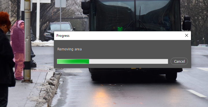 Once you enable the Remove Tool, brush over the object you want to remove. I recommend brushing around the object's edges first and then filling in the entire center—and make sure you do it in one continuous motion. Note that you need to brush outside the object’s edge, too, not just inside it, as when selecting it. Brush the object’s shadow as well if it has one. I had to use the tool more than once to get a convincing result with this picture of a car I wanted to remove from a street scene.
