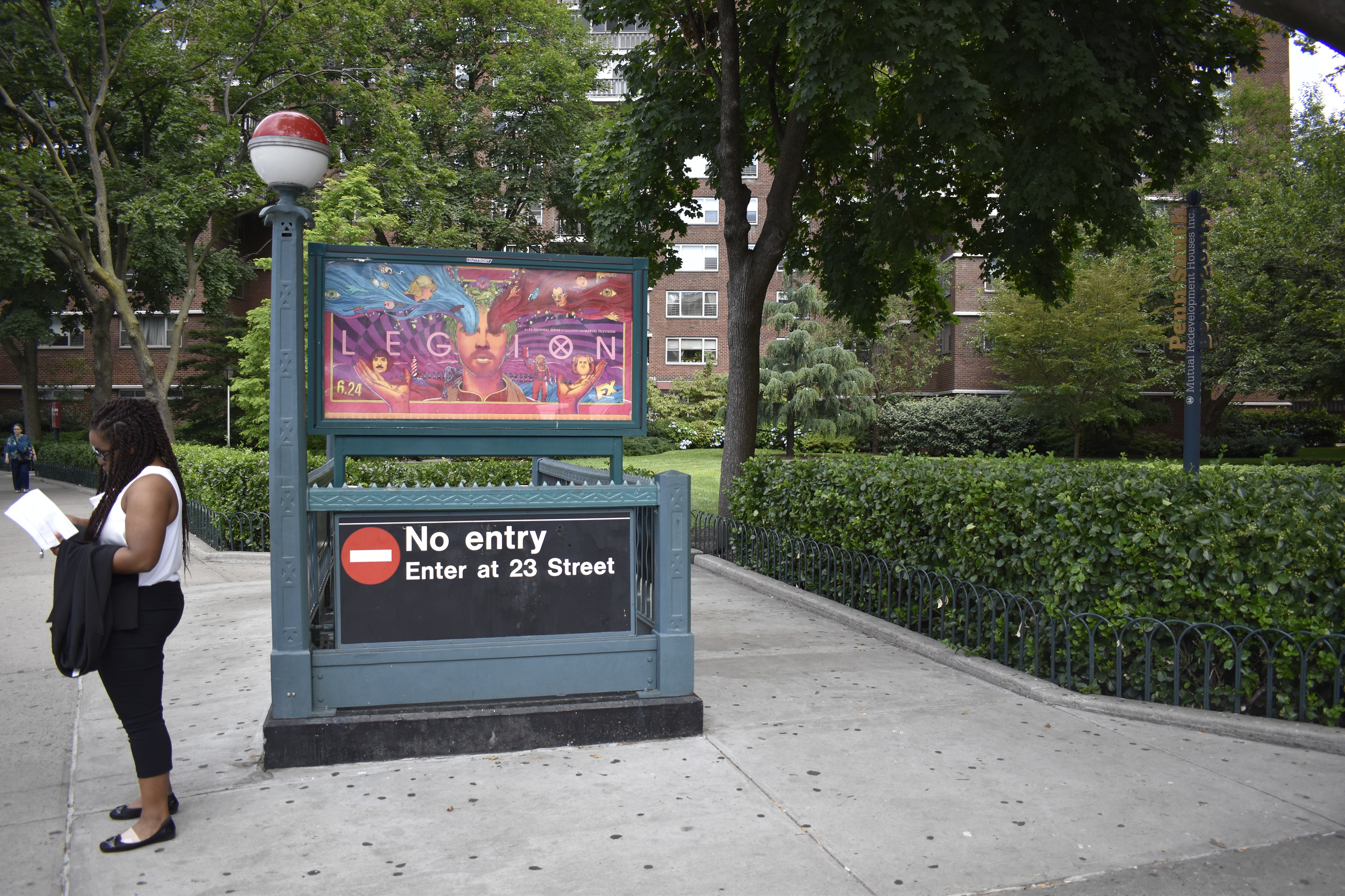 Women standing near NYC subway enter at 23rd Street