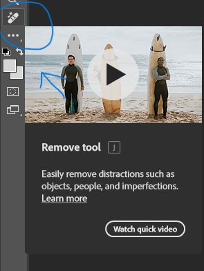 The Remove Tool is in the Band-Aid section of the left-hand toolbar. Adjust the brush size in the options bar (near the top of the image, where it says 93) to be large enough to brush over the object you want to remove without a lot of brushing.
